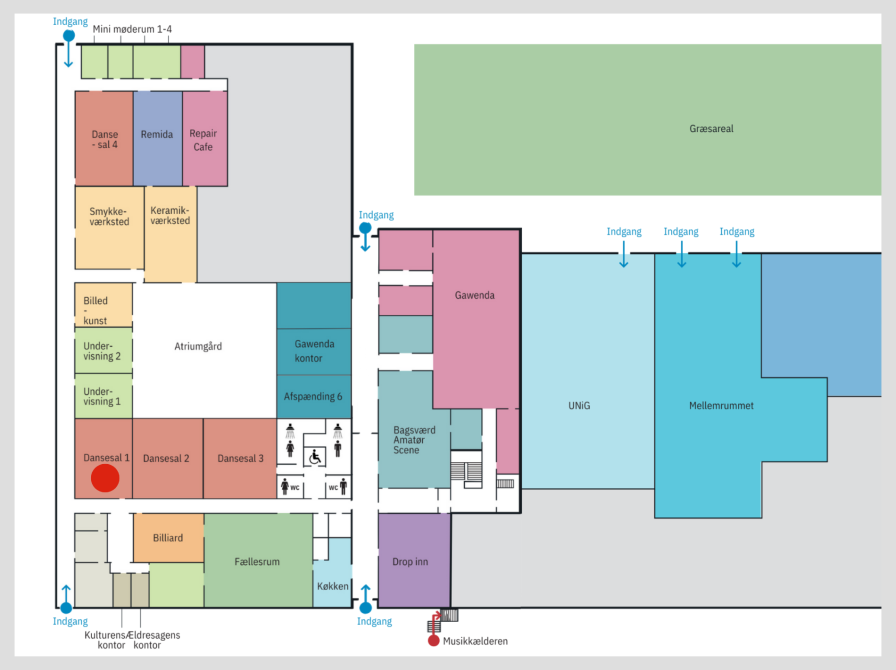 Dansesal 1 er et godt lokale til dans, gymnastik, yoga mv.
